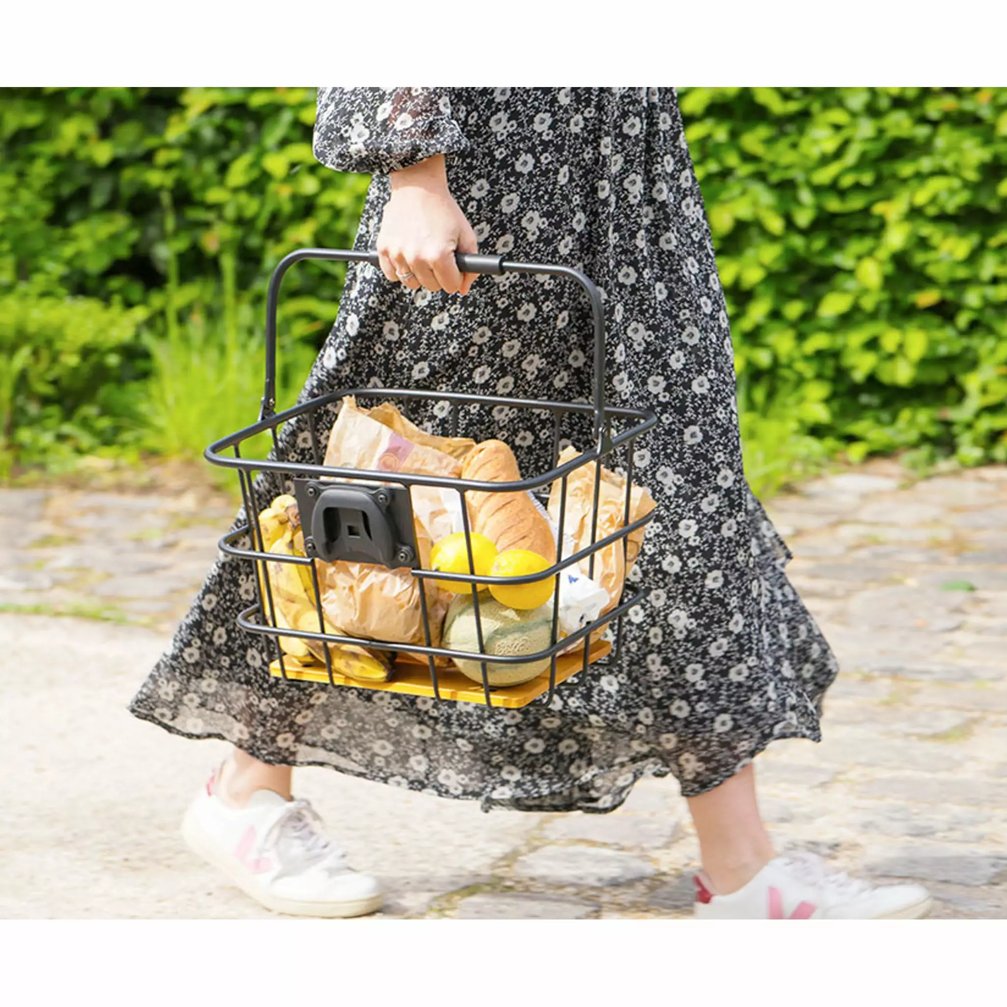 Une fois la fixation attachée au guidon, il suffit de clipser le panier de façon simple et amovible. Une fois retiré du vélo, le panier se transporte comme un sac de course par sa anse, dont le milieu est revêtu de mousse confortable.
